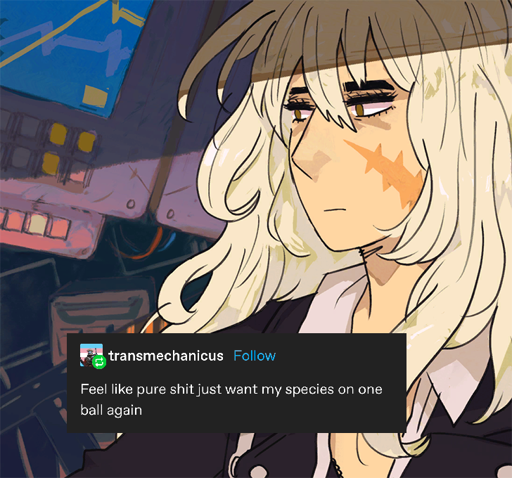 a picture of luna-terra from hwbm, a tall woman with pale skin, blond hair, and a large scar on her face. text post by transmechanicus reads: feel like pure shit just want my species on one ball again