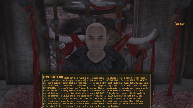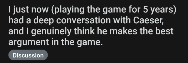 Friendly reminder I side with the Legion because in the setting, the thing keeping humanity in an apocalyptic state isn’t a forgetting of technical capability but an inability to reach scale because the roads between stable settlements aren’t secure.