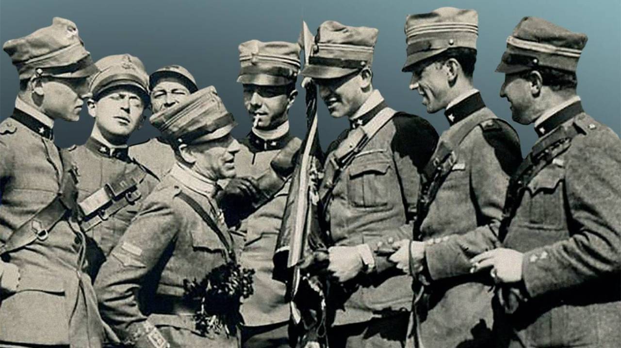 Italian Poet and Writer Gabriele D’Annunzio talking to Royal Italian Army Cavalry Officers. Fiume,1919
