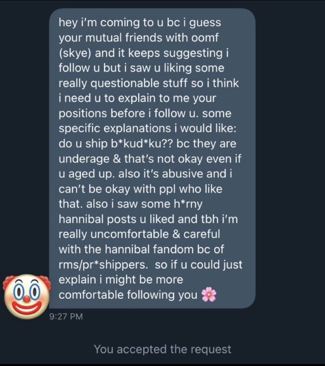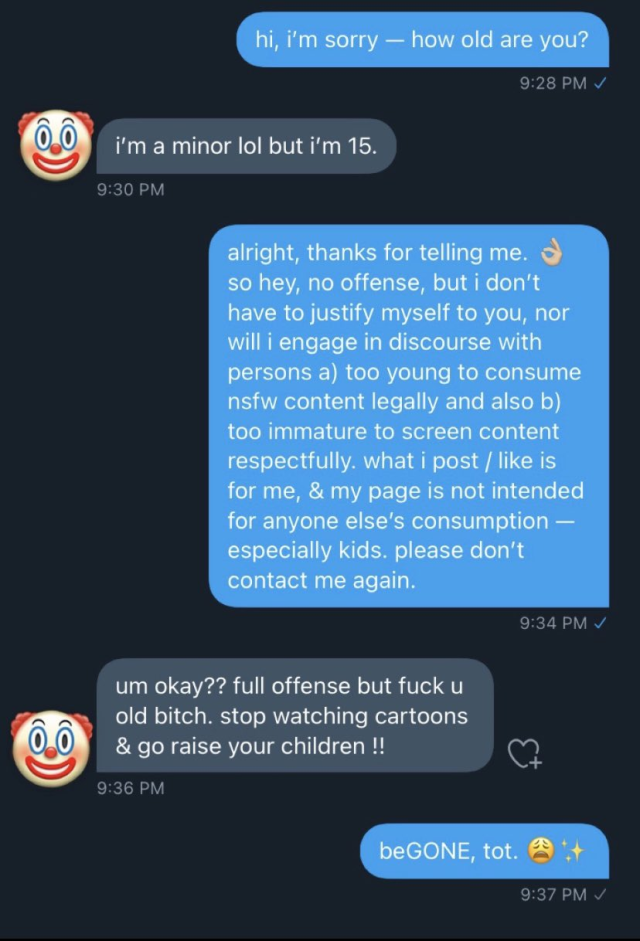 It’s funny to me that you think it’s to stop adults from talking to kids, because my first thought was that it’s to stop kids from harassing adults in retaliation for them shipping Problematic Ships or w/e.
