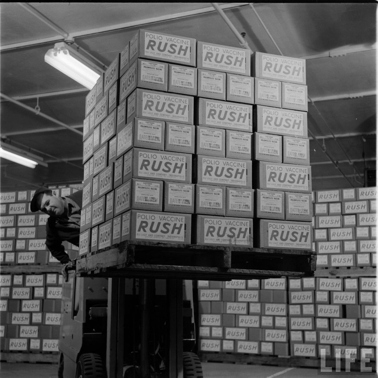 by @Watchung Forklift operator stacks pallets of Polio vaccine in an Indiana warehouse. These doses of the Salk vaccine were...