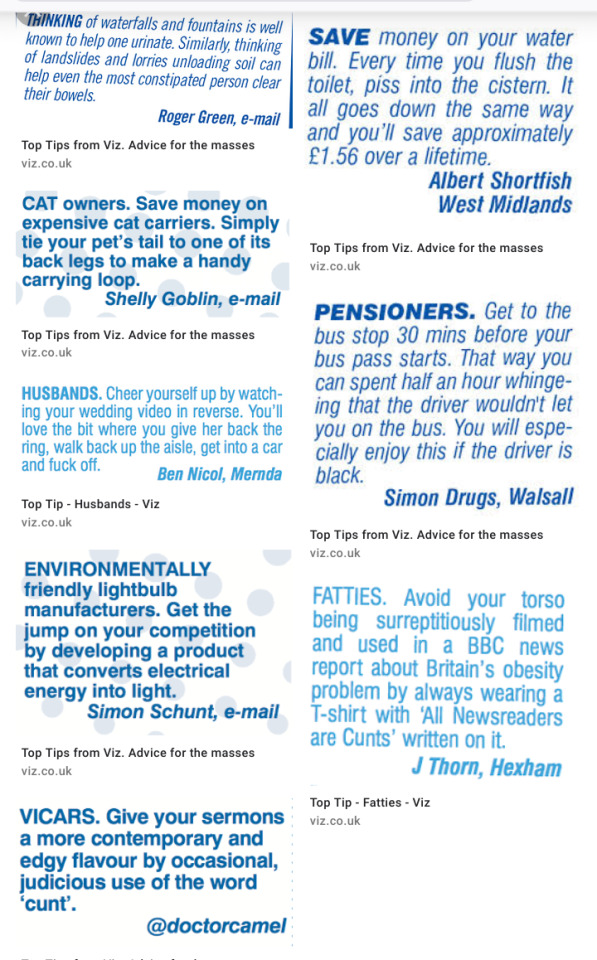 The acme of the “Top Tip” is published in Viz, a parody of the cheap press, especially comics. an algorithmically selected sample: