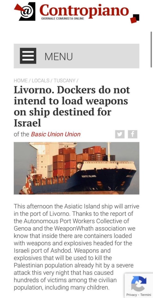 Love to see it! Italian dock workers refuse to load weapons and arms headed for israel. also shout out to the autonomous port workers collective of genoa and the weaponwhath association for reporting on the contents of the containers. this is what’s happens when workers unite and have control over their labor.