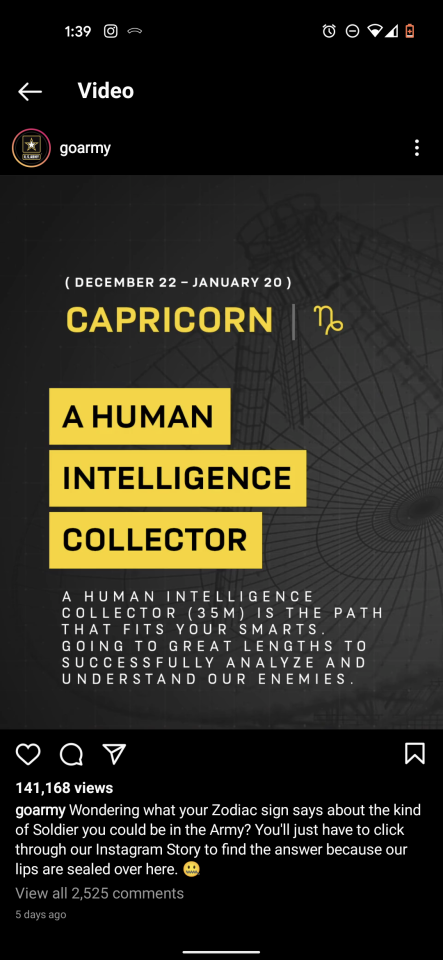 the US army is posting on Instagram telling you what your zodiac sign says about what kind of soldier you'll be. this is not a...