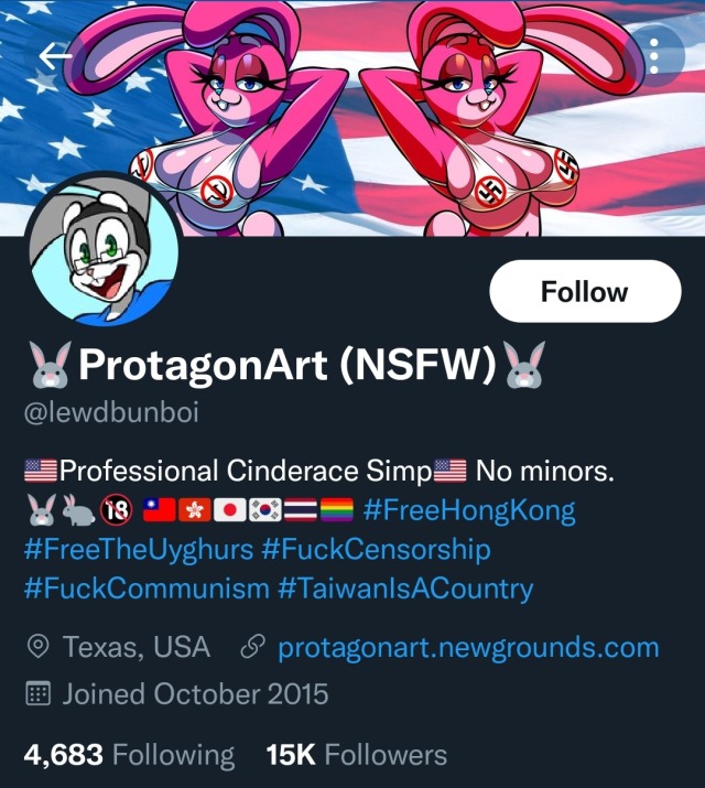 imagine being this guy. like for real imagine it. put yourself in his shoes. what is it like to live this way. why does his fursona have a receding hairline managed by supercuts and the summer robotics camp glasses. what is a cinderace and is it pronounced like liberace. why the south korea and costa rica flags. which big titted centrist rabbit did he draw first, the antifascist or anticommunist one