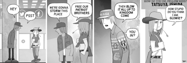 But, actually, we can discern something important from this strip: Tats isn’t picking up alt-right talking points secondhand from interacting with radfems/TERFs/transphobic groups and 4chan lingo filtering through to him. He’s hanging out in the kind of groups where people have reason to be paranoid that their co-posters are FBI agents. And even if Tats isn’t personally aware of the racist origins of the term, it speaks volumes as to the company he’s been keeping