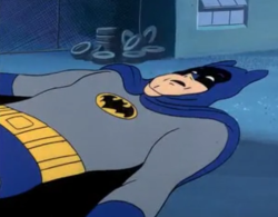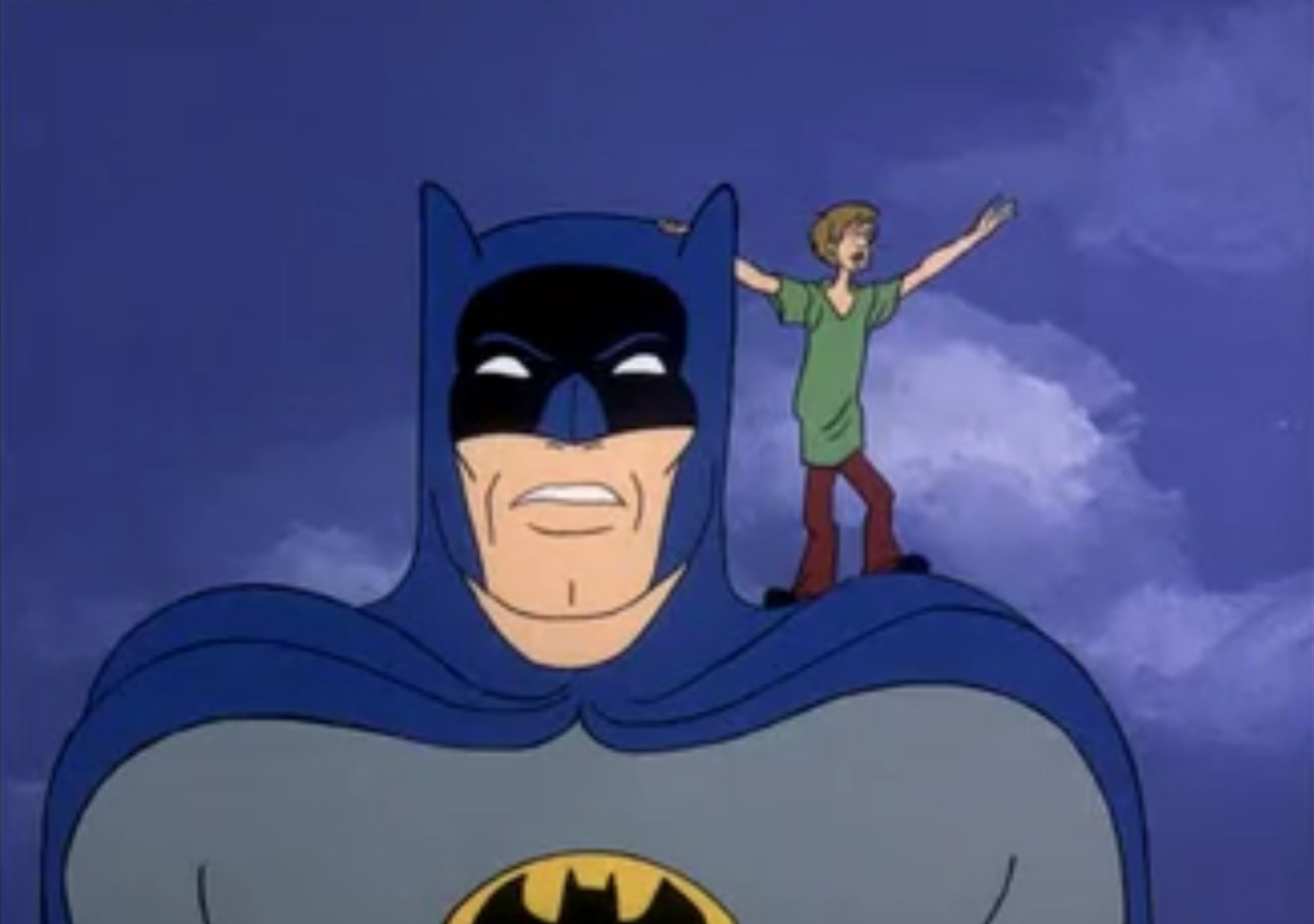 you cant fuck the giant inflatable batman featured in scooby doo meets batman. the people who made this movie were probably high, and im not implying by that statement that the movie (actually two episodes of a seventies tv cartoon strung together and rereleased in 2002) is especially surreal or creative or visually interesting because thats not the kind of of art that high people make. high people dont want to put that amount of effort into anything, let alone a process as arduous and time consuming as animation. scooby doo meets batman is the kind of movie you would actually make if you were high, in that everything about it feels like it was made up on the spot by someone who didnt care too much. not to say that it isnt brilliant, in fact i heartily recommend it, for the halloween season and for any other time of the year. whats scarier than scooby doo AND batman, interacting, occasionally? nothing comes to mind for this blogger.. by the way i dont think ive ever included two images in a post before but this is what the giant inflatable batman looks like after they deflate it