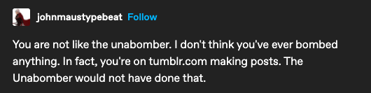 “We should bomb society somewhat.” “And yet you participate in society. Curious!”