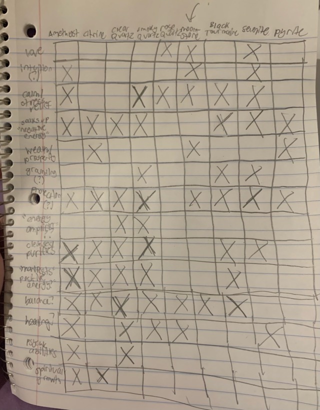 Along the side I list major powers of crystals, along the top I list important crystals. Then I mark the boxes whenever one of the website mentions one of the powers as a major important quality of one of the crystals.