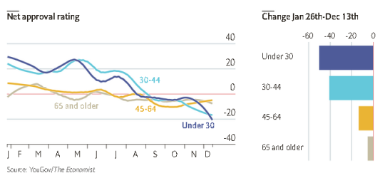 disapprove. The net rating of -21 points is the worst for any age group.