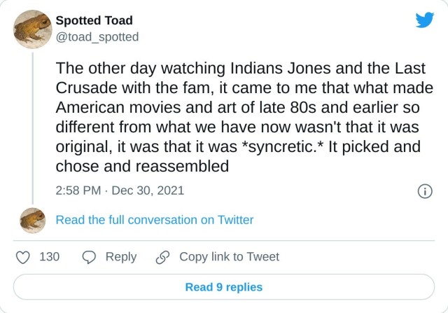Post: “The other day watching Indians Jones and the Last Crusade with the fam, it came to me that what made American movies and art of late 80s and earlier so different from what we have now wasn’t that it was original, it was that it was syncretic. It picked and chose and reassembled. It was attached to and part of a broad commercial and popular culture–both the other blockbusters of the time, as well as the pulp fiction & B movies & canned history it drew from–that jostled and competed with each other without sitting neatly in one ‘universe’ or 'property’.”