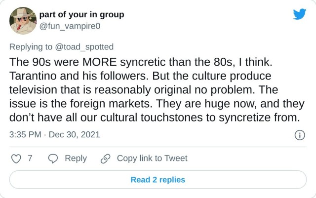 Reply: “The 90s were MORE syncretic than the 80s, I think. Tarantino and his followers. But the culture produces television that is reasonably original no problem. The issue is the foreign markets. They are huge now, and they don’t have all our cultural touchstones to syncretize from.”