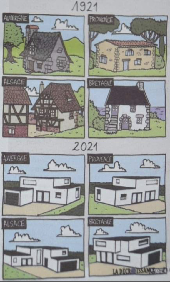 I mean the takeaway here is quite literally that modern homes are not built with load-bearing exterior walls of materials so heavy as to require local sourcing and limit maximum footage, they all use cladding over structural skeletons more advanced than the “Alsace” style to enable low, sprawling floorplans