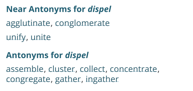 Interestingly this is a back-formation and doesn’t actually relate to the etymology! Spell comes from a Germanic word indicating talk or speech (same as “spelling”), whereas dispel is from Latin and is actually dis + pel, where the “pel” is the same as in “compel”, “impel”, etc.