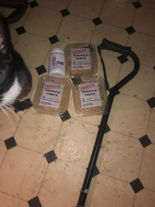 Ok, got some capsules of creatine for on-the-go recharging, a cane where the shaft tube curls around to be the grip (the...