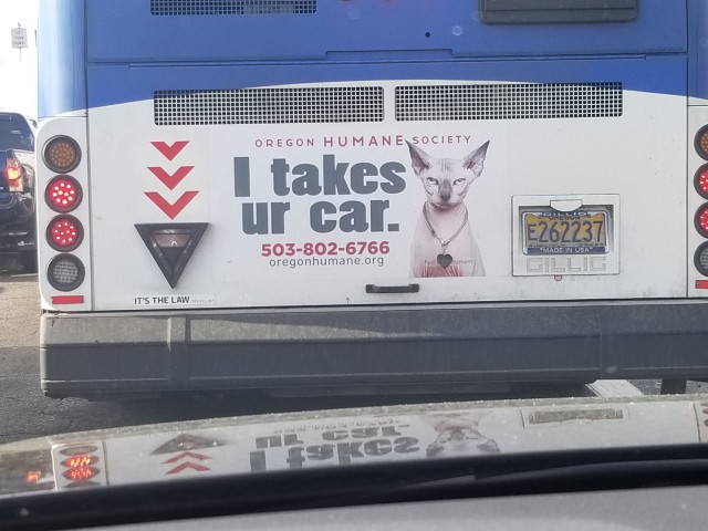 I’m still baffled by this ad I saw while driving a customer’s car today.. It’s lolcats? In 2022? And it’s not a cute cat but one of those hairless ballsack cats? And it’s threatening? And it was on a bus, so it’s saying this scrotal cat will steal my car, forcing me to ride the bus?