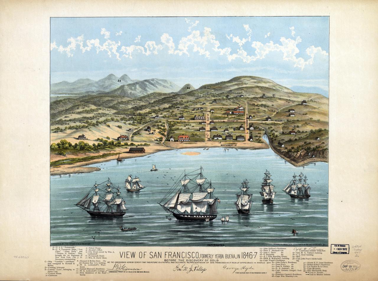 View of San Francisco, formerly Yerba Buena, in 1846-7 before the discovery of gold. By Bosqui Eng. & Print, 1884.