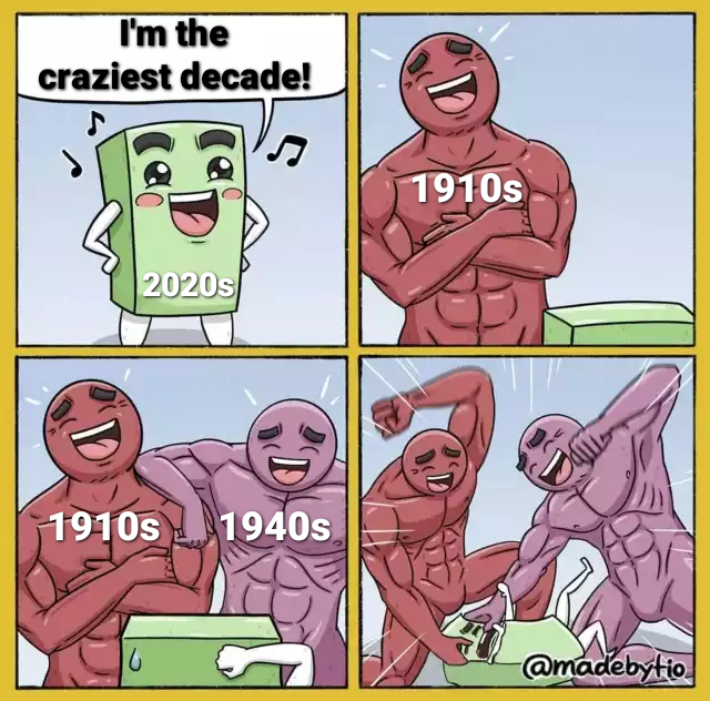 The first image is of a four panel comic. A little block labelled 2020s says in a sing-songy way, ‘I’m the craziest decade!’ A large, muscular person labelled 1910s comes in, followed by someone else labelled 1940s; both are laughing. They both start to beat up the 2020s, still laughing.