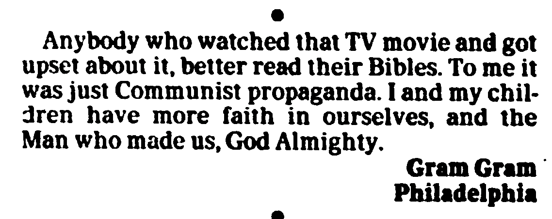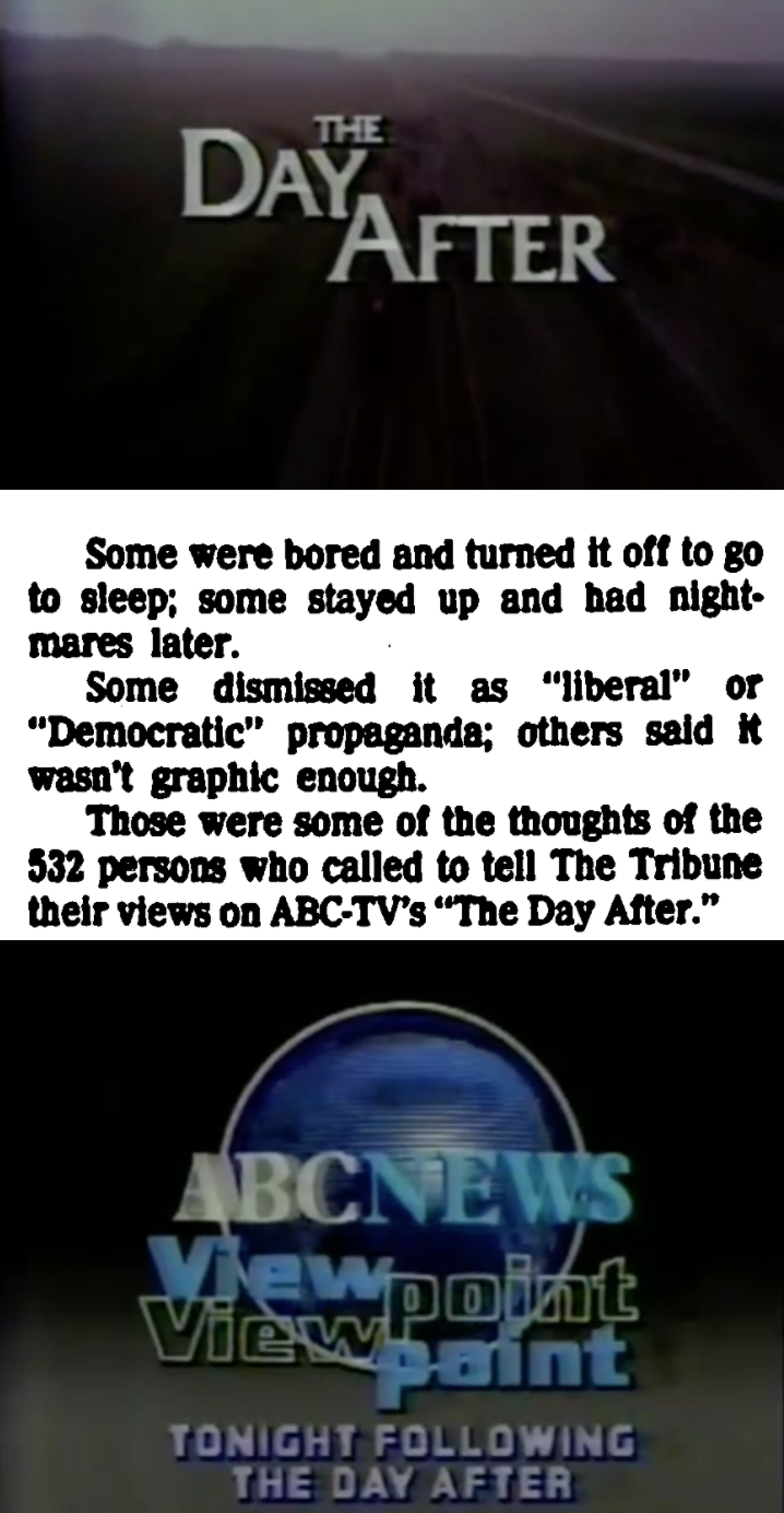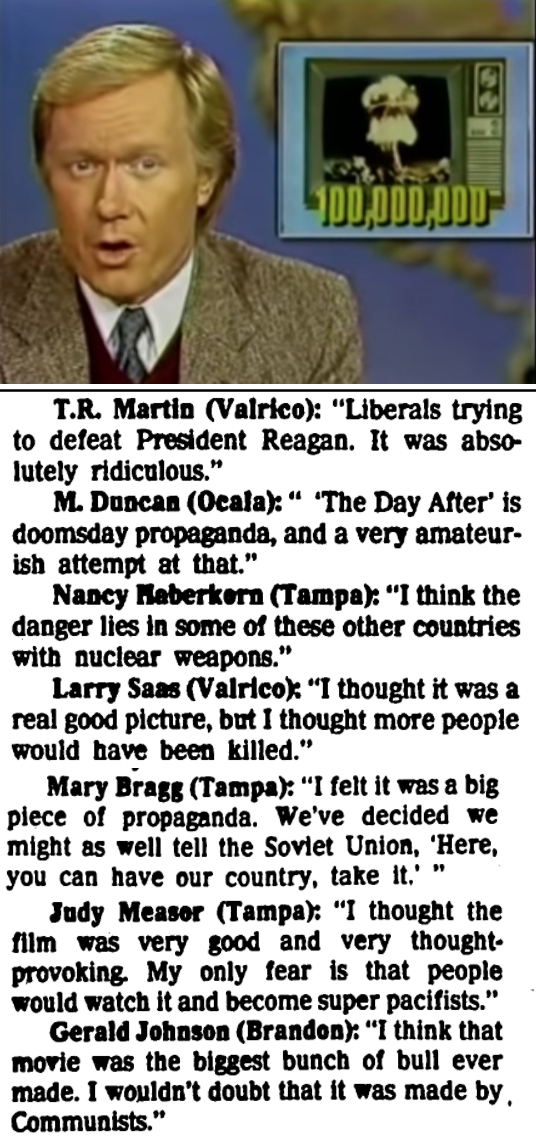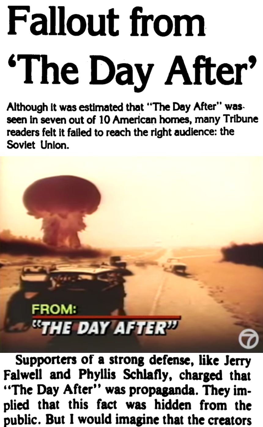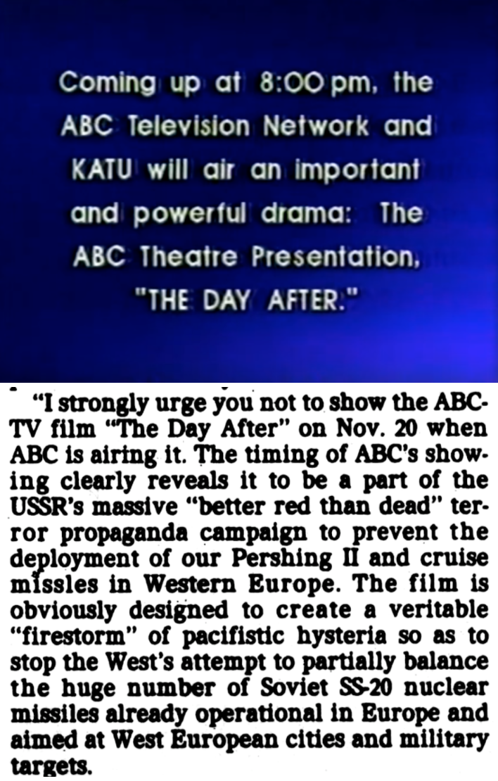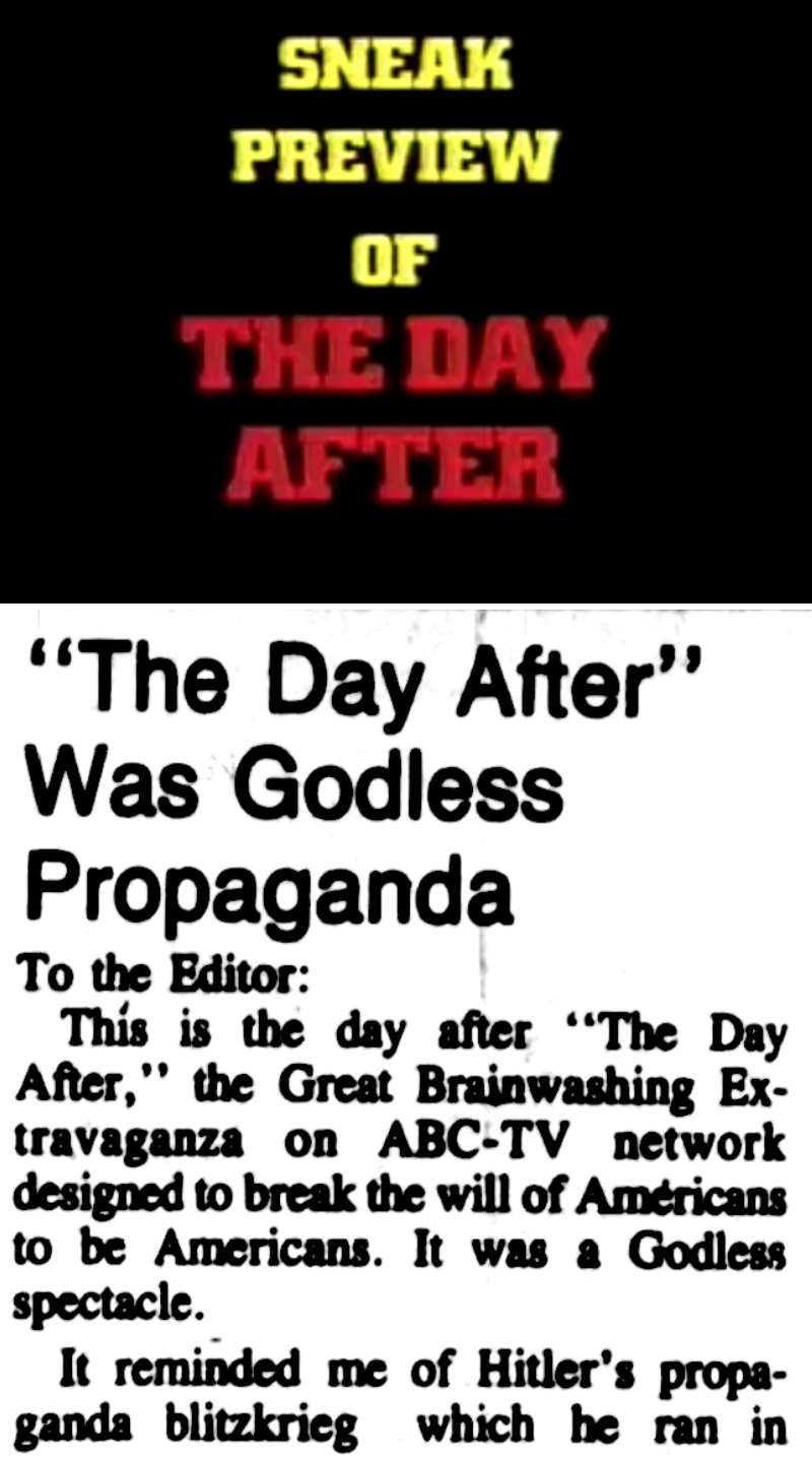 The Day After (1983), the high-rated made-for-tv movie about nuclear annihilation, was dismissed by reactionaries as nothing but communist propaganda