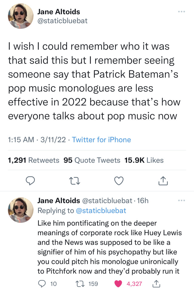 The reason it parallels contemporary pop criticism is that we’re still living in the 1980s. Neoliberalism and its values haven’t gone anywhere, but have in fact penetrated ever deeper even into ostensibly countercultural spaces. The gospel of self-empowerment preached by certain pop musicians and critics today is the exact same one that was relatively novel in the '80s and which American Psycho satirises.
