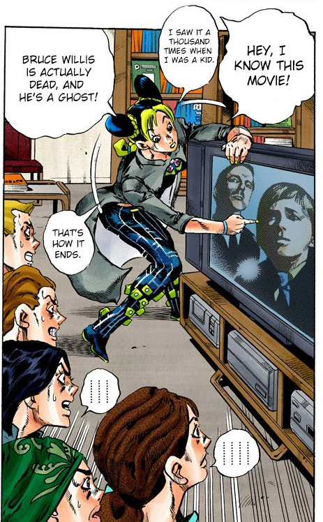 My favorite part of this one is that this chapter of JoJo’s Bizarre Adventure went to print in Japan very shortly before The Sixth Sense, but Araki had already seen it because he’s a freeaboo, so not only is jolyne spoiling The Sixth Sense for everyone in this room, she’s spoiling it for all of real life Japan