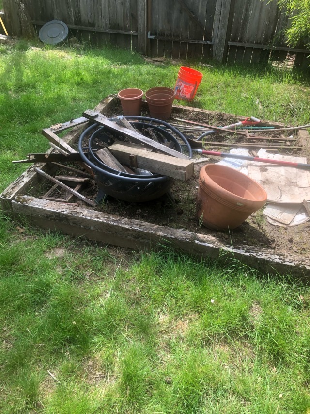 This is the thing I originally thought was a shitty raised bed, full of flowers, and eventually connected with the abandoned pile of sand outside the backyard gate to realize had been a homemade sandbox