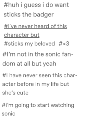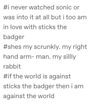 in the past >12 hours I’ve posted this multiple people in the tags or otherwise have admitted to being in love with Sticks the Badger. Nature is healing