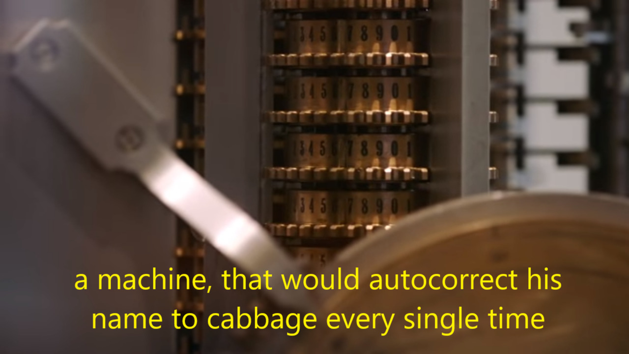 Two close-up photos of a difference engine, captioned with the text, “Babbage never foresaw the terrible consequences of his invention” and “a machine, that would autocorrect his name to cabbage every single time.”]