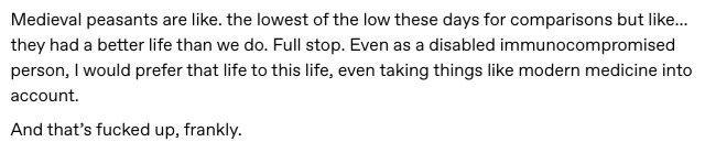 The other problem with this line of reasoning, and the one I find more concerning as far as intellectual dishonesty, is how cherry-picked this idea of “work” is. We’re mostly talking about agricultural labor peasants performed for their lords, but peasants often owned livestock as well, and the requirement to feed and care for them didn’t take days off. Moreover, peasants spent time at a variety of tasks that even poorer modern people in the developed world usually buy their way out of, including making clothes, doing household maintenance by hand, and various work involved in food storage and conversion that refrigeration and economies of scale have made irrelevant to modern people. We can discuss the relative value of working for oneself, alienated labor, and so on, but the fact remains that this was work. (At this point someone may bring up “women’s work” as an argument against this claim, but it’s worth noting that many medieval women also performed a substantial amount of field labor, so it’s not as if they could stay home all day and just attend to this sort of household work.)