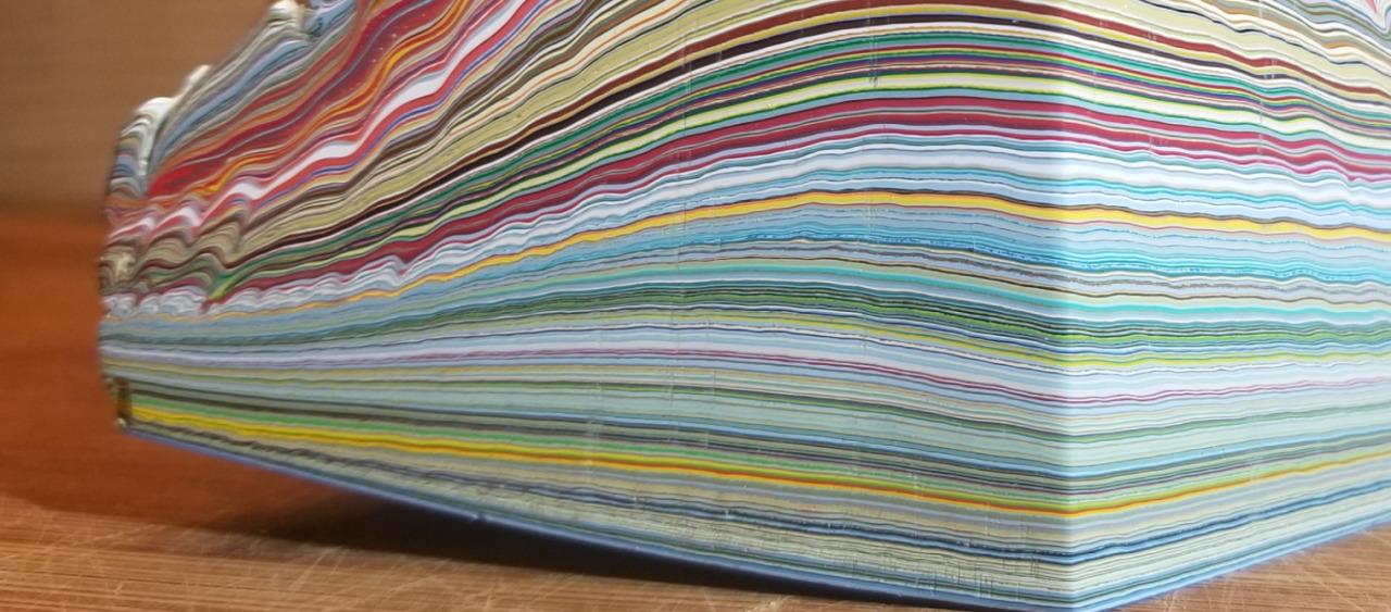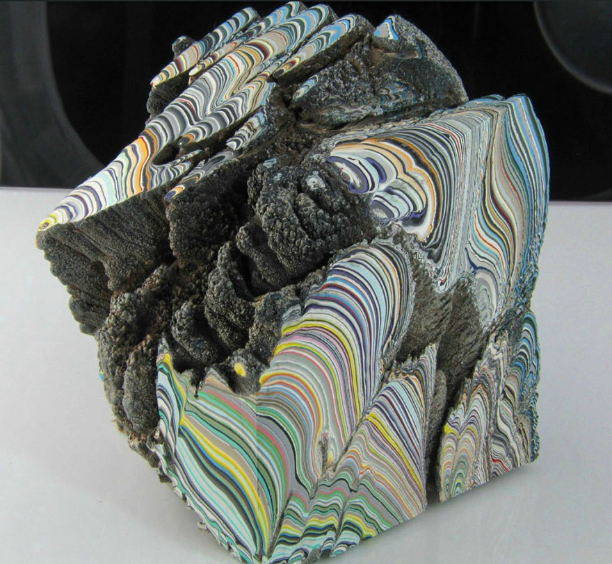 Fordite, also known as Detroit agate or Motor City agate, is old automotive paint which has hardened sufficiently to be cut and polished. It was formed from the buildup of layers of enamel paint slag on tracks and skids on which cars were hand spray-painted (a now automated process), which have been baked numerous times. In recent times the material has been recycled into jewelry.