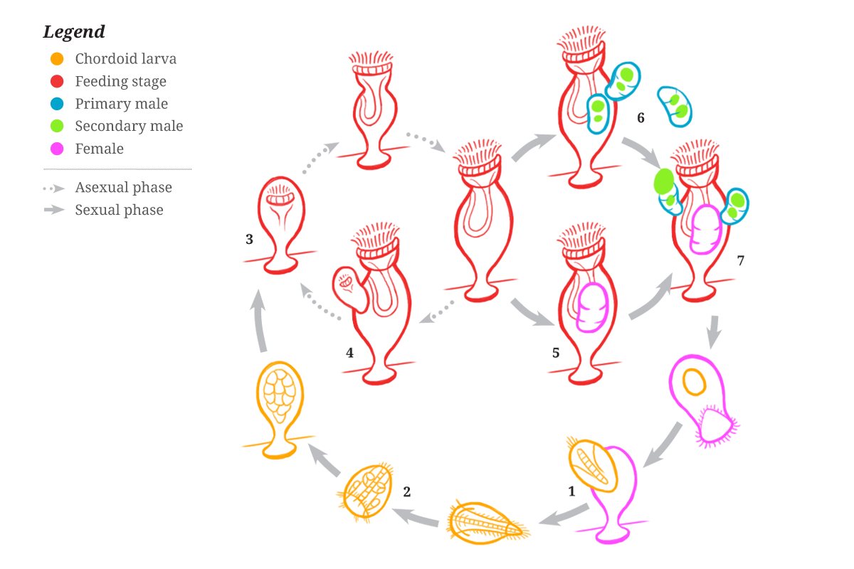 At last, the primary female emerges, and the cycle continues. This means a life cycle of two alternating generations for females, and three for males, for a grand total of four possible stages (feeder, female, primary male, dwarf male) overall! (Unless you count females as equivalent to either primary males or dwarf males, in which case it’s only three.)