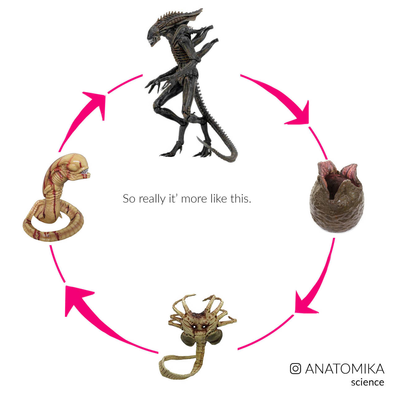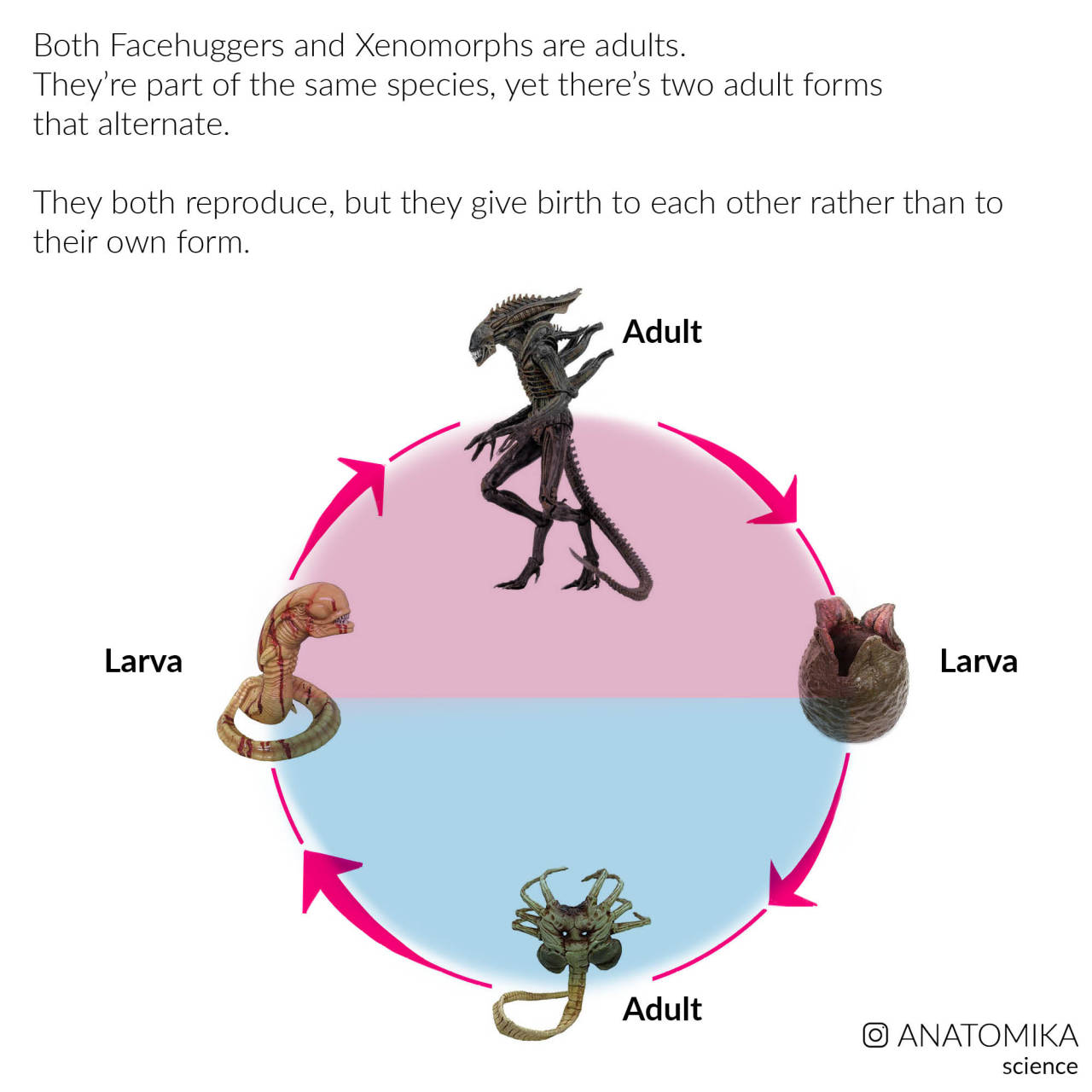 I also immediately thought of Symbion pandora but I’d also like to point out that the xenomorph “egg” is visibly made of living tissue, so it would also qualify as its own organism; a sessile stage that gestates the facehugger!