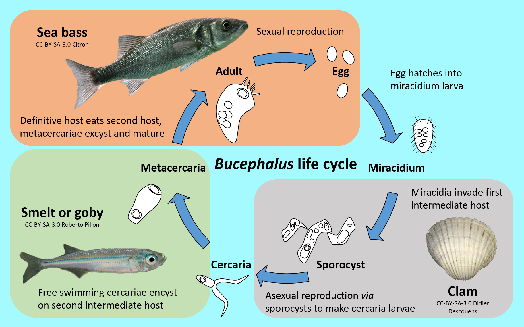 Here’s the life cycle of the Bucephalus trematodes, a type of parasitic flatworm. You can see that the sporocysts do not mature directly, but reproduce asexually to yield the cercaria that will ultimately become adults. This gives us two alternating generations.