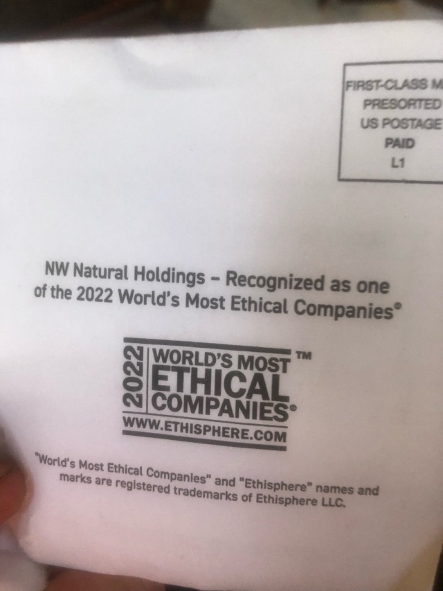 My “a totally ethical corporation” bill envelope has people asking a lot of questions already answered by the envelope