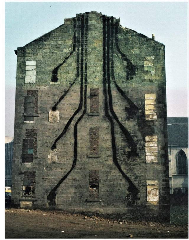 Soot traces mark the location of fireplaces and flues in an old house having been demolished in Glasgow.