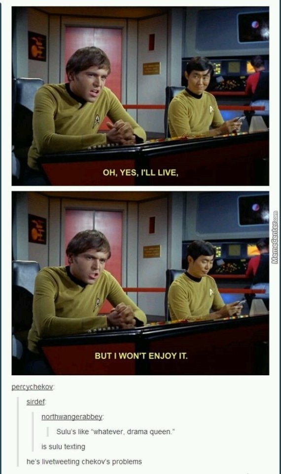 at the risk of sounding like a raving lunatic, i think one of my favorite trekkie memes/posts is that one where someone comments on a screenshot of tos and asks if sulu is texting, because it PERFECTLY encapsulates star trek’s strange little place at the intersection of pop culture and the tech world: