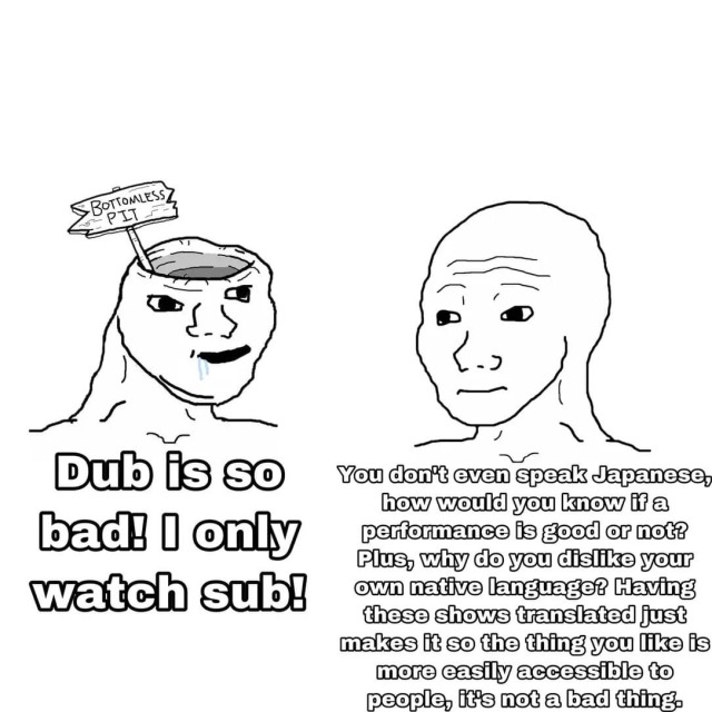 Man a lot of anime into the 2000s was not dubbed very well. Like, the theatrical release of Spirited Away was well-dubbed, but VHS releases of whatever at Suncoast would have like weekday afternoon kids’ animation levels of voice acting and directing at best, with an awkwardly translated script synced to foreign mouth timing by an iffy in-house team (which often provided the semi-pro voices), a lot of stuff that had nuance and characterization you could still pick up from the Japanese was totally washed out in English
