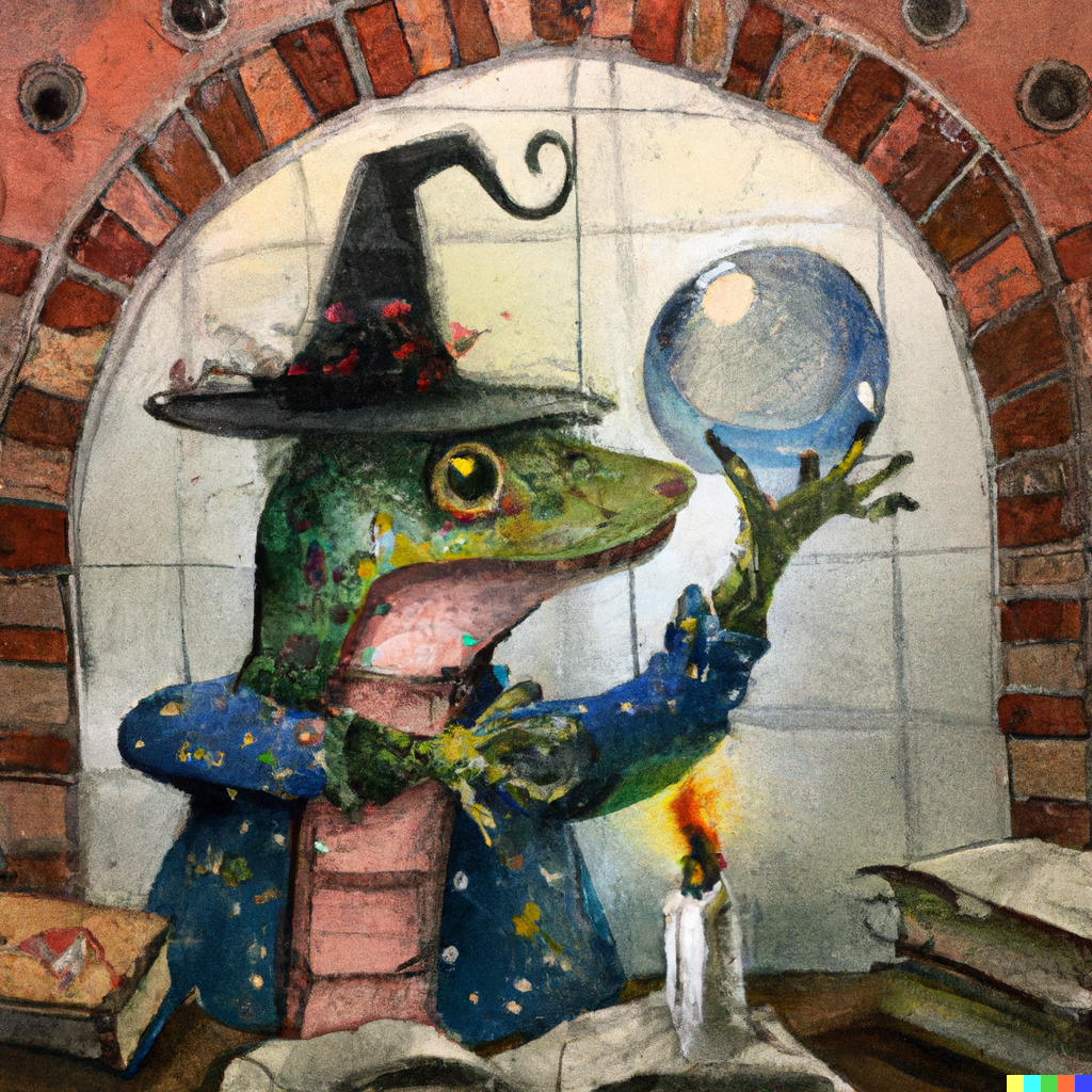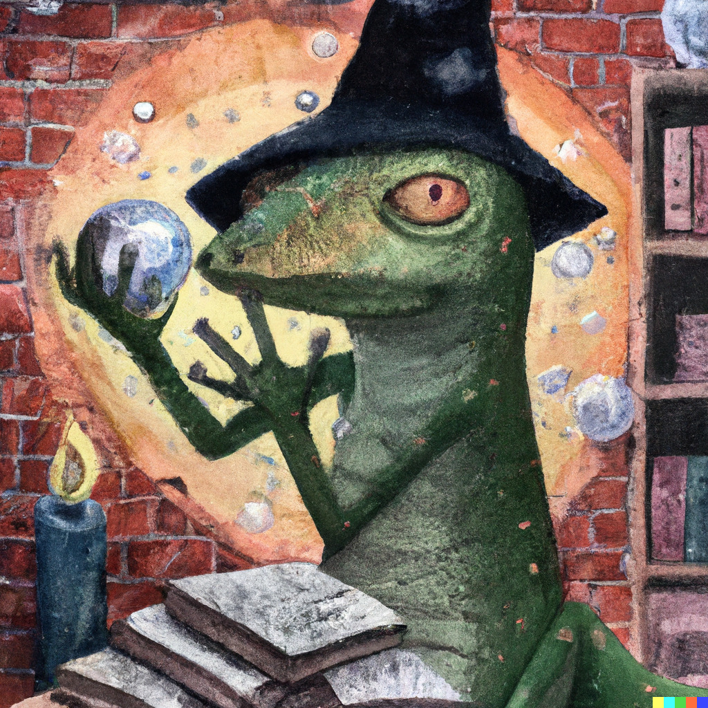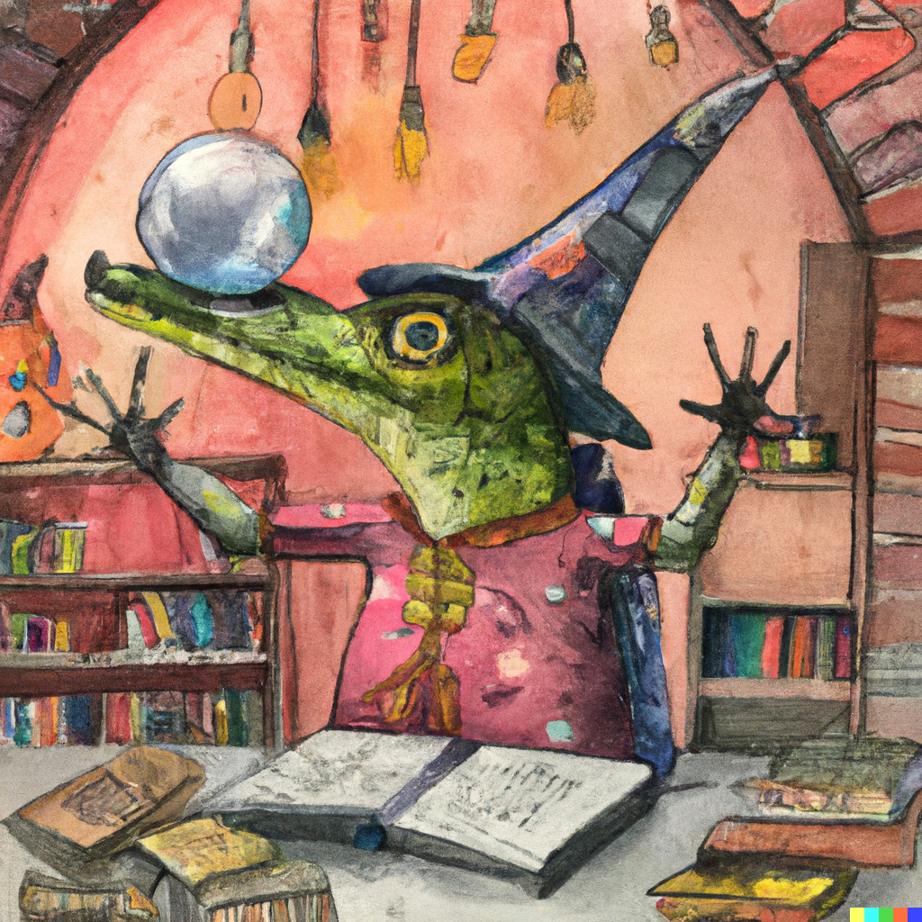 “A Tiny Lizard Wearing a Blue Wizard Hat Casts a Magic Spell Using a Crystal Ball in a Stone Brick Room Full of Books, Watercolor, Illustration”
