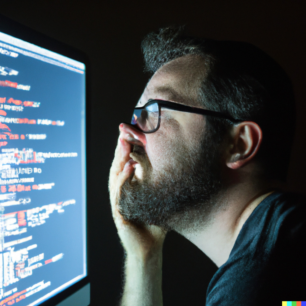 “The look on a developer’s face when, after hours of debugging their code, they discover the problem to be a missing semicolon, dramatic, emotional photograph”