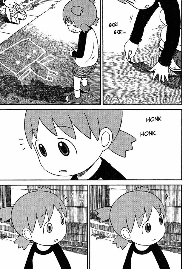 this scene really highlights one of the most impressive parts of yotsuba to me, which is how effectively its able to recreate for an adult audience the sense of wonder that very young children have towards the world, giving us a taste of just how strange and interesting seemingly normal things are to someone as young as yotsuba. the way the geese are quietly built up to through strange sound effects, and how the camera shows their approach in detail, how it lingers on yotsubas reaction and lets us take in just how new and exciting this is to her, before hitting us with a double page spread of that same thing on an overwhelming scale… its masterful