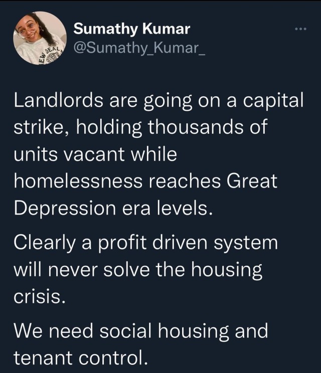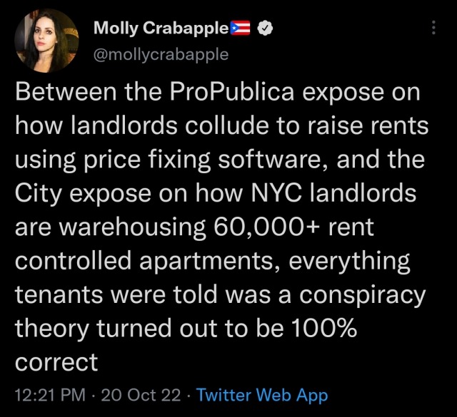 No landlords possess such a share of units on the market such that they could capture enough of a general rise in rents from constrained supply to make up for rents on the ones they were holding back, and landlords do not forego income themselves for the sake of enriching others in the “landlord” class, JFC, have you ever met landlords?
