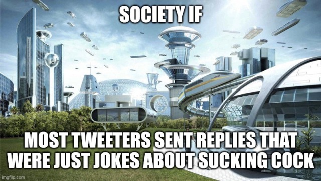 [ID: meme image of a utopian futuristic city with the text “society if most tweeters were just jokes about sucking cock”]