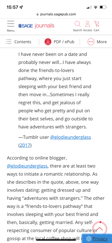 Jokes aside, this quote is how the researchers kick off an exploration of the under-researched concept of “friends to partners” with a call to social researchers to reframe their (apparently exclusive) focus on “dating” as the sole initiating event of romantic relationships. It’s actually a very interesting paper; apparently social scientists and pop culture focus their attention on the process of “dating”, a frankly heteronormative lens that insists on very specific behaviours and scenarios, in which single people market themselves to each other at bars. Meanwhile, in the actual people surveyed in the study, it appears far more common for people to prefer “friends to lovers” as a relationship pathway.