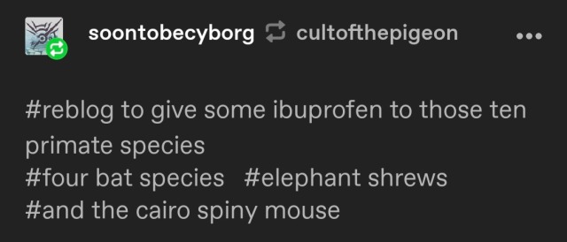 aurpiment:Shout out to the ten primate species, four bat species, elephant shrews, and the Cairo spiny mouse. Nobody else gets it