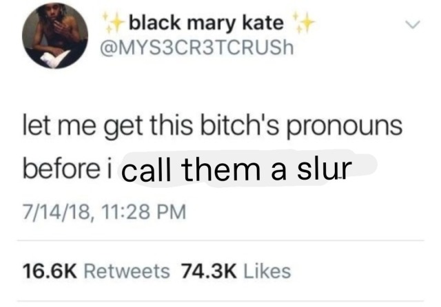 There was this guy in secondary school who used to call me a dyke all the time until I had to ask him to stop and explained I was a guy. From then on he called me a faggot and used my correct pronouns all the time, and moved away at some point but I saw him at my uni today and the first thing he said to me was “Alex! You still a fag?”