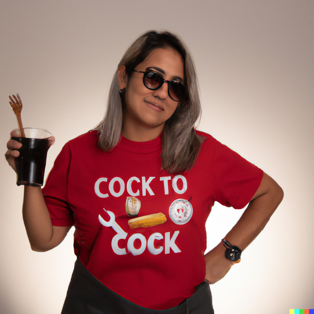 A cook wearing a t-shirt that says “It is cooking o'clock.” while drinking a coke. Created by DALL·E 2, AI that can create...