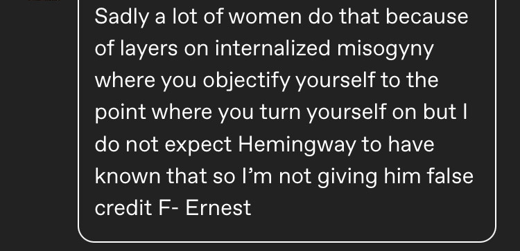 I’m not trying to defend Hemingway here as it sounds like most likely he was being very male-gazey (I haven’t read the work in question), but dismissing a woman being turned on by her own attractiveness as merely suffering from internalized misogyny, as well as characterizing her experience as “sad”, doesn’t seem reasonable to me. (The logic behind such an analysis of course comes from the assumption that being attracted to a woman is equivalent to objectifying her, which I have issues with, but that’s another post.)