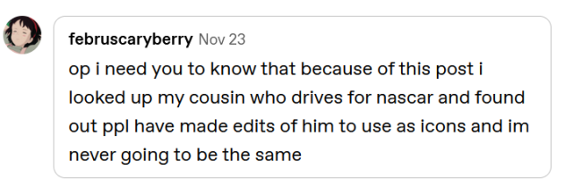 did you guys know that people ship the real life white boys who drive nascars because i didn’t until somebody reblogged this with that added