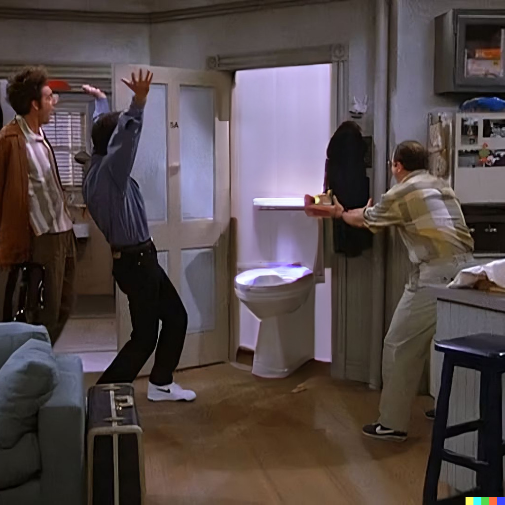 Seinfeld episode where Kramer installs a toilet in Jerry’s doorway as a shared building amenity, “The Convenience”, season 2,...