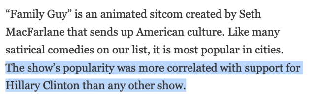 Enjoying Family Guy had the strongest geographic correlation with voting for Hillary Clinton of any show that NYT looked at in 2016